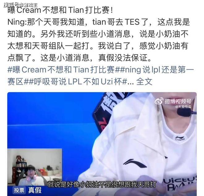 比赛结束之后,打野选手宁王在直播的时候就公开表示听到了一些小道消息,小奶油不太想和小天组队一起打比赛,我说白了,感觉小奶油有点飘了,这是小道消息,真假没法保证。熟悉的粉丝应该知道,宁王是lpl赛区心直口快的代表,他能够说出来的一些消息,基本上都是圈内人流传的,看来369小奶油都对小天有一定的意见。刚刚回归比赛的呼吸哥在赛后采访时也是公开调侃lpl的比赛强度,甚至还不如uzi杯。
